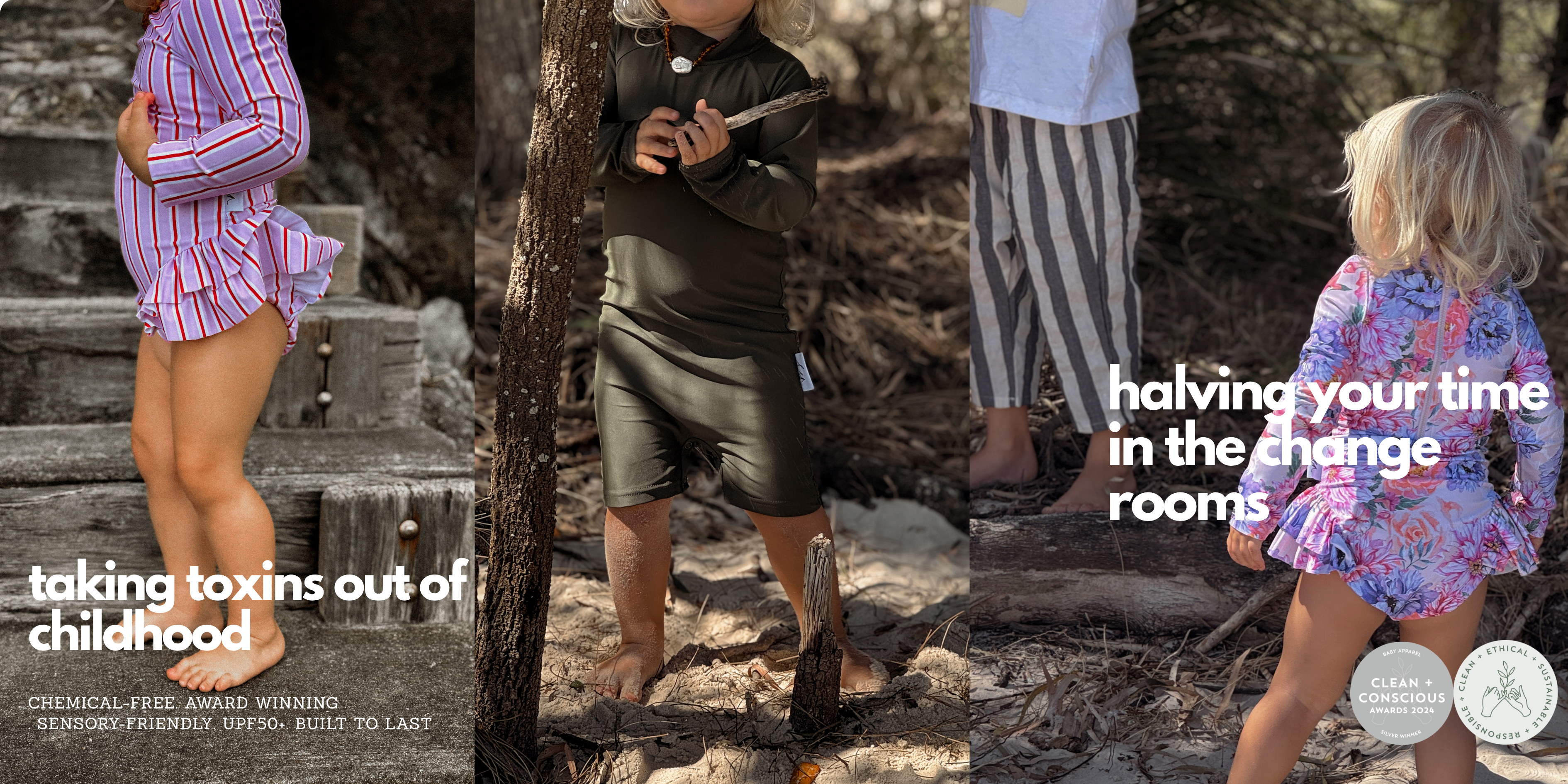 When we think about summer days — sandy toes, salty smiles, and bright kids swim moments — the last thing on our minds should be toxins. But many mainstream brands use what’s known as “forever chemicals” (PFAS) in their fabrics — and that’s where the story turns serious.